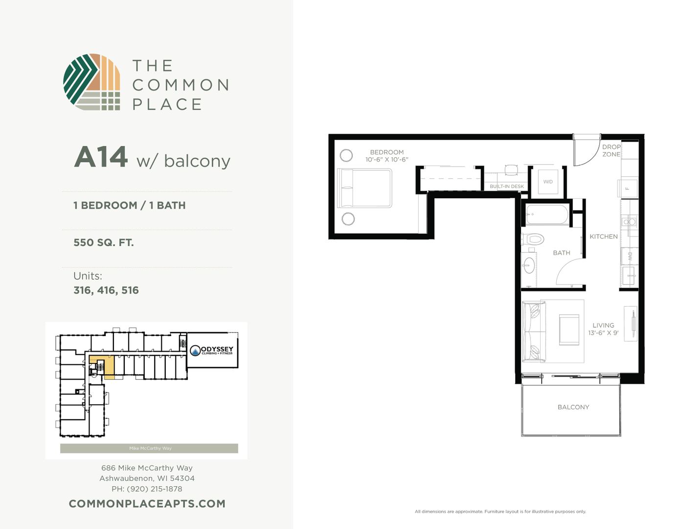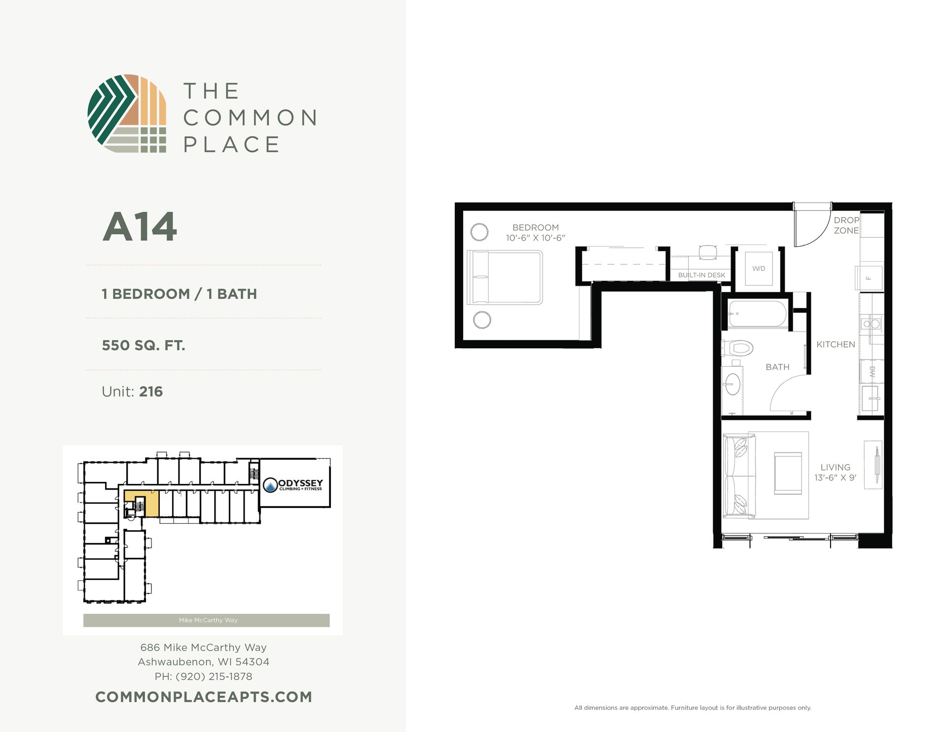 This is a 1 bedroom, 1 bathroom unit in the Common Place, a 5-story mixed-use building located in the Village of Ashwaubenon's Sports & Entertainment District, just blocks from Lambeau Field & Titletown amenities. The property has 88 residential units and a recreational climbing gym. All units are equipped with in-unit washer & dryer, dishwasher, and select units have balconies. A limited number of our studios also have murphy beds. Ask us about fully furnished units! The Common Place is a pet-friendly property.