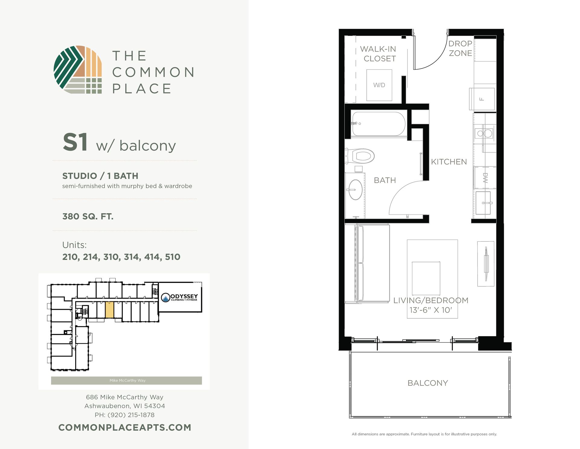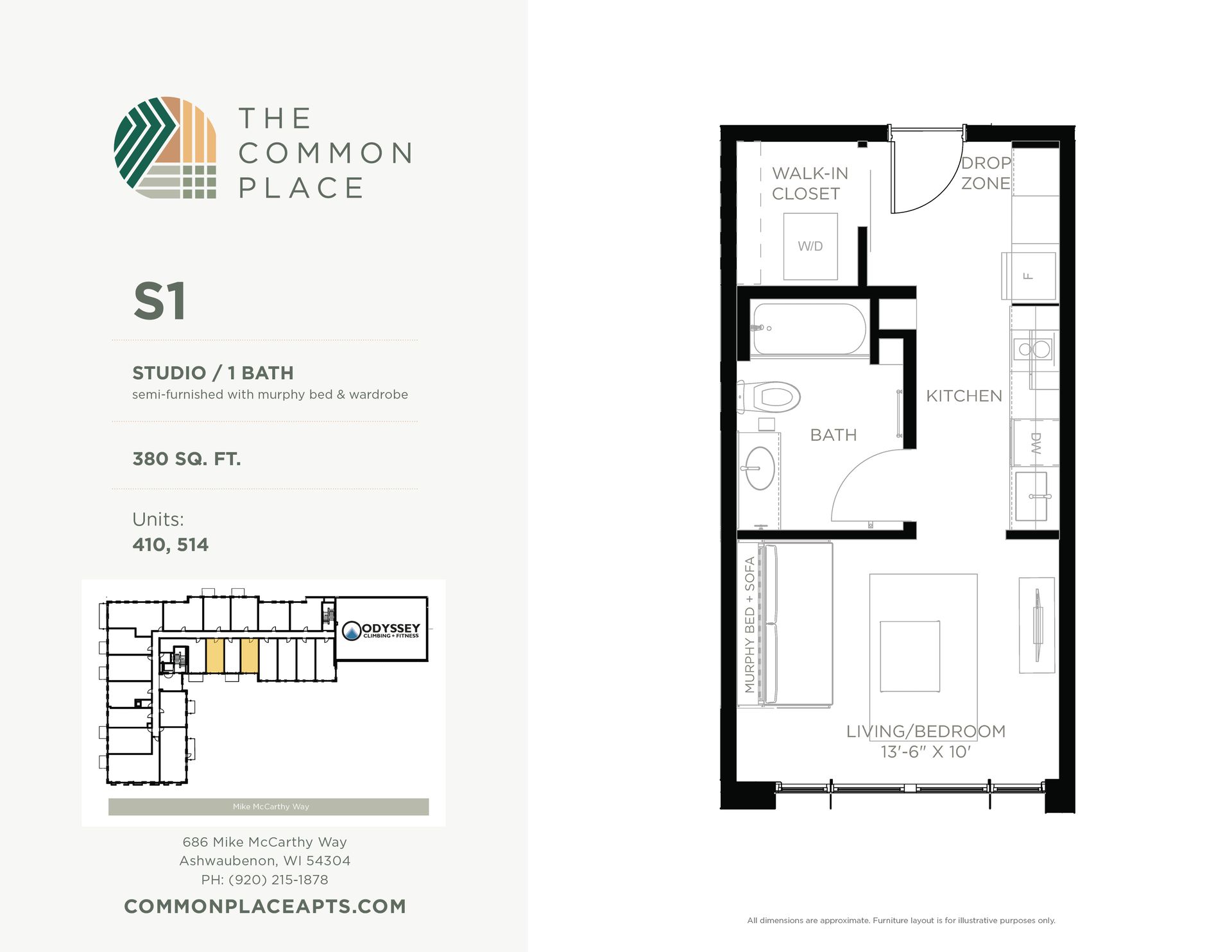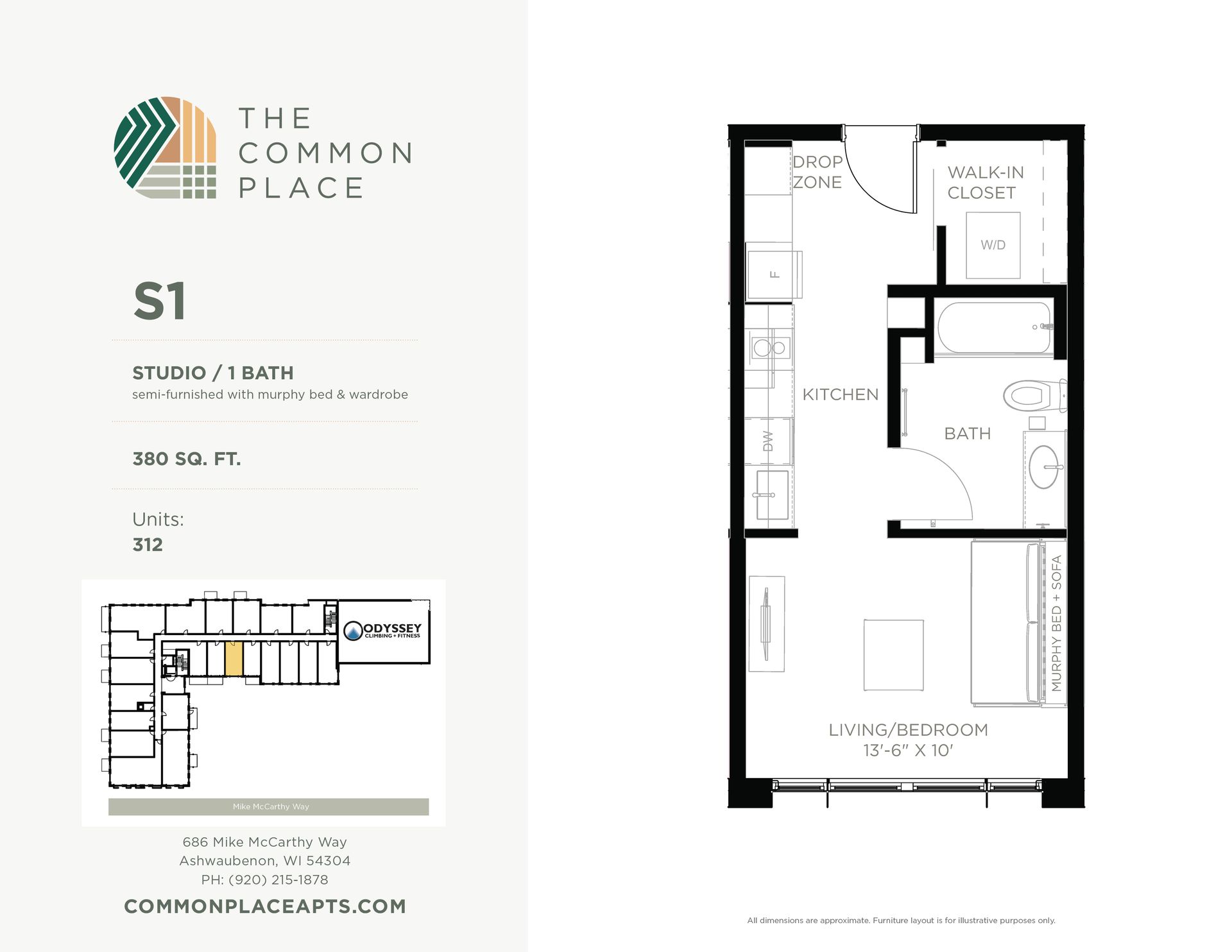 This is a studio unit in the Common Place, a 5-story mixed-use building located in the Village of Ashwaubenon's Sports & Entertainment District, just blocks from Lambeau Field & Titletown amenities. The property has 88 residential units and a recreational climbing gym. All units are equipped with in-unit washer & dryer, dishwasher, and select units have balconies. A limited number of our studios also have murphy beds. Ask us about fully furnished units! The Common Place is a pet-friendly property.