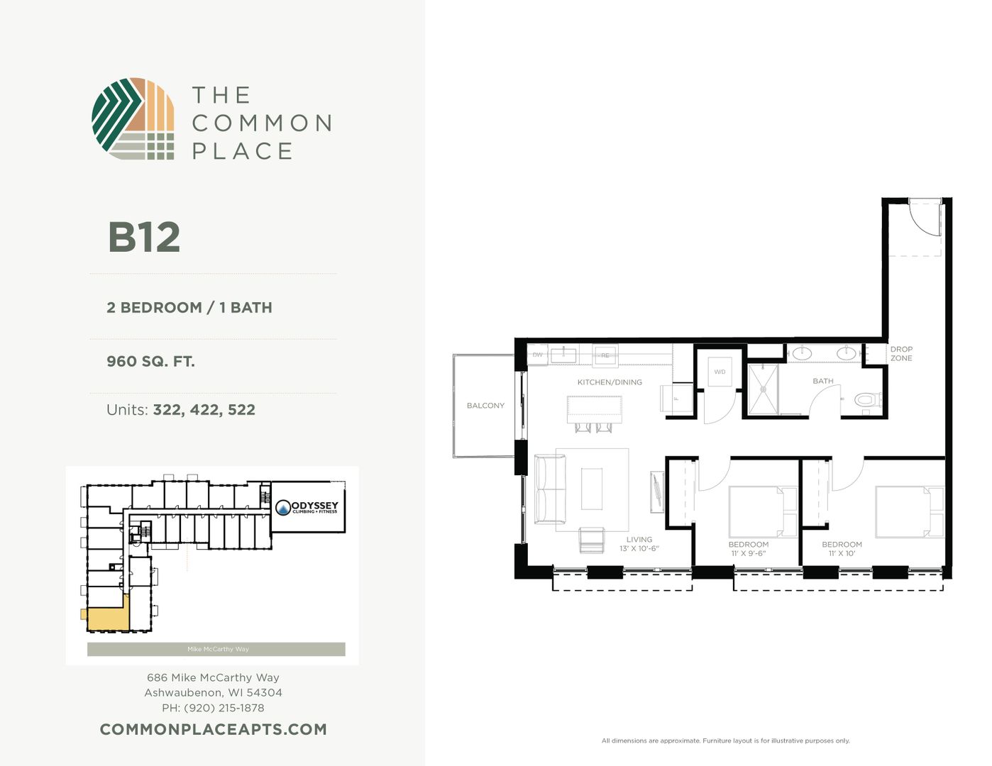 This is a 2 bedroom, 1 bathroom unit in the Common Place, a 5-story mixed-use building located in the Village of Ashwaubenon's Sports & Entertainment District, just blocks from Lambeau Field & Titletown amenities. The property has 88 residential units and a recreational climbing gym. All units are equipped with in-unit washer & dryer, dishwasher, and select units have balconies. A limited number of our studios also have murphy beds. Ask us about fully furnished units! The Common Place is a pet-friendly property.